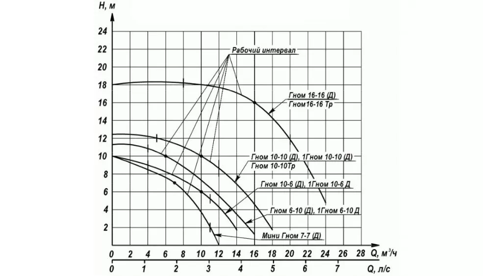 Погружные насосы ГНОМ 10-10Тр температура перекачиваемой жидкости до 60 C° центробежные насосы моноблочные со встроенным электродвигателем, широко применяются на строительных площадках, для откачивания гравийно-глинистых и грунтовых вод из котлованов, траншей, ям и др. в промышленном и гражданском строительстве, при эксплуатации гидросооружений, метрополитенов и шахт, а также в сельском хозяйстве для орошения и осушения. Встроенные асинхронные электродвигатели, как правило, герметизированные общепромышленного исполнения. Производя подбор насоса ГНОМ, необходимо обращать внимание на основные параметры его работы, а именно на производительнось (подача), выраженную в м3/час, на напор, который создает насос при заданной производительности и выраженный в метрах водяного столба, а также на рабочий интервал, в пределах которого находится рекомендуемый изготовителем режим работы насоса.
