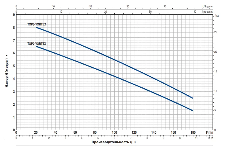 Графические характеристики дренажного насоса PEDROLLO TOP 3 VORTEX