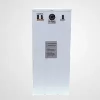 Электрический котел ЭРДО ЭВПМ-48 предназначен для водяного отопления зданий, имеющих открытую или закрытую отопительную систему, работающую при давлении не более 0,2 МПа (20 м водяного столба) при напряжении трёхфазной сети 380В или однофазной сети 220В. Электрокотлы могут использоваться в качестве основного или резервного источника теплоснабжения. Они не нуждаются в постоянном обслуживании, экологически безвредны и безопасны. Электроводонагреватель состоит из корпуса, стальной ёмкости, пульта управления, закреплённого внутри корпуса. В верхней части ёмкости, во фланце, смонтированы трубчатые электронагреватели. Элeктрoкoтёл имеет встроенный пульт управления, предназначенный для переключения мощности и регулирования температуры нагрева теплоносителя. Регулятором температуры элeктрoкoтла служит капиллярный термостат, термочувствительный элемент которого закреплён в средней части стальной ёмкости (резервуара). В котле имеется колодка для подключения циркуляционного насоса. Его включение (если он подключен к водонагревателю) производится клавишей, расположенной на лицевой панели водонагревателя. Для защиты от перегрева электроводонагреватель оборудован самовозвратным датчиком аварийного отключения (температура срабатывания 90†5 оС). Верхний напорный и нижний обратный патрубки предназначены для присоединения водонагревателя к системе отопления. На лицевой стороне водонагревателя расположена ручка регулятора температуры и клавиши переключения мощности. На задней части корпуса имеется сальник для ввода в пульт питающего кабеля и болт для крепления заземляющего провода. ЭВПМ-48 оснащён колодкой для подключения выносного комнатного терморегулятора.