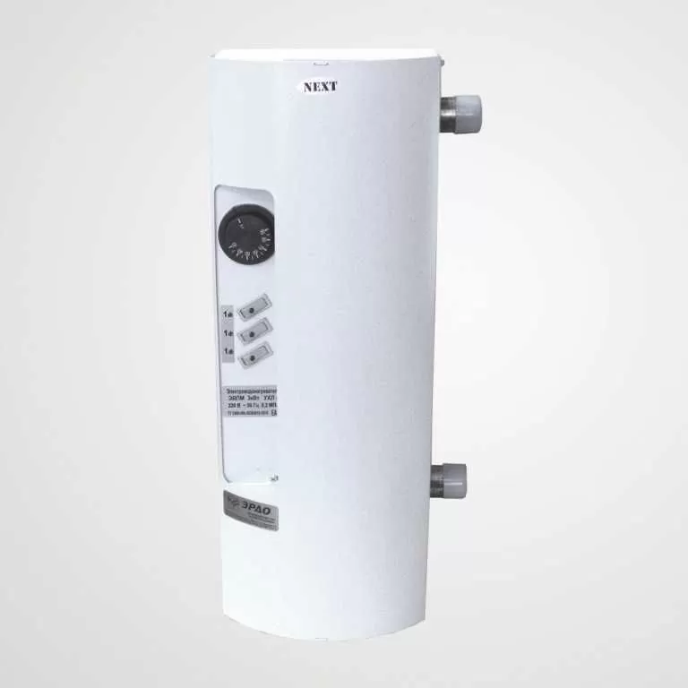 Электрический котел ЭРДО ЭВПМ-NEXT-3 предназначен для водяного отопления зданий, имеющих открытую или закрытую отопительную систему, работающую при давлении не более 0,2 МПа (20 м водяного столба) при напряжении трёхфазной сети 380В или однофазной сети 220В. Электрокотлы могут использоваться в качестве основного или резервного источника теплоснабжения. Они не нуждаются в постоянном обслуживании, экологически безвредны и безопасны. Электроводонагреватель состоит из корпуса, стальной ёмкости, пульта управления, закрепленного внутри корпуса. В верхней части ёмкости, во фланце, смонтированы трубчатые электронагреватели. Элeктрoкoтёл имеет встроенный пульт управления, предназначенный для переключения мощности и регулирования температуры нагрева теплоносителя. Регулятором температуры элeктрoкoтла служит капиллярный термостат, термочувствительный элемент которого закреплен в средней части стальной ёмкости (резервуара). Для защиты от перегрева электроводонагреватель оборудован самовозвратным датчиком аварийного отключения (температура срабатывания 90†5 оС). Верхний напорный и нижний обратный патрубки предназначены для присоединения водонагревателя к системе отопления. В электрокотле ЭВПМ-NEXT реализована возможность изменения расположения патрубков подачи и обратки относительно лицевой панели. На лицевой стороне водонагревателя расположена ручка регулятора температуры и клавиши переключения мощности. На нижней части корпуса имеется заглушка ступенчатая для ввода в пульт питающего кабеля. Болт для крепления заземляющего провода расположен внутри корпуса на кронштейне крепления колбы котла.