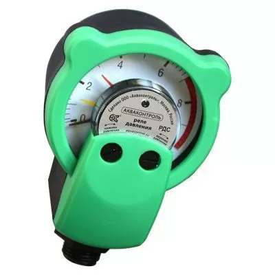 РДС-180 реле давления воды стрелочное - устройство, способное заменить стандартное электромеханическое реле давления и манометр. Предназначено для обеспечения автоматической работы однофазных насосов в системах водоснабжения и полива, а также защиты насоса от работы по «сухому» ходу. Принцип работы защиты от «сухого хода» заключается в том, что, если в течение 180 секунд давление в системе не достигнет нижнего порога давления, РДС отключит насос и перейдёт в режим защиты от сухого хода. Для возобновления работы насоса необходимо нажать кнопку старт/стоп после чего РДС перейдет в рабочий режим. Предельно допустимые значения включения и выключения насоса визуально устанавливаются с помощью регулировочных винтов и разноцветных стрелочных указателей (маркеров), что дает возможность легко зафиксировать пороги включения и выключения насоса, а встроенный манометр позволяет контролировать текущее давление в системе водоснабжения.