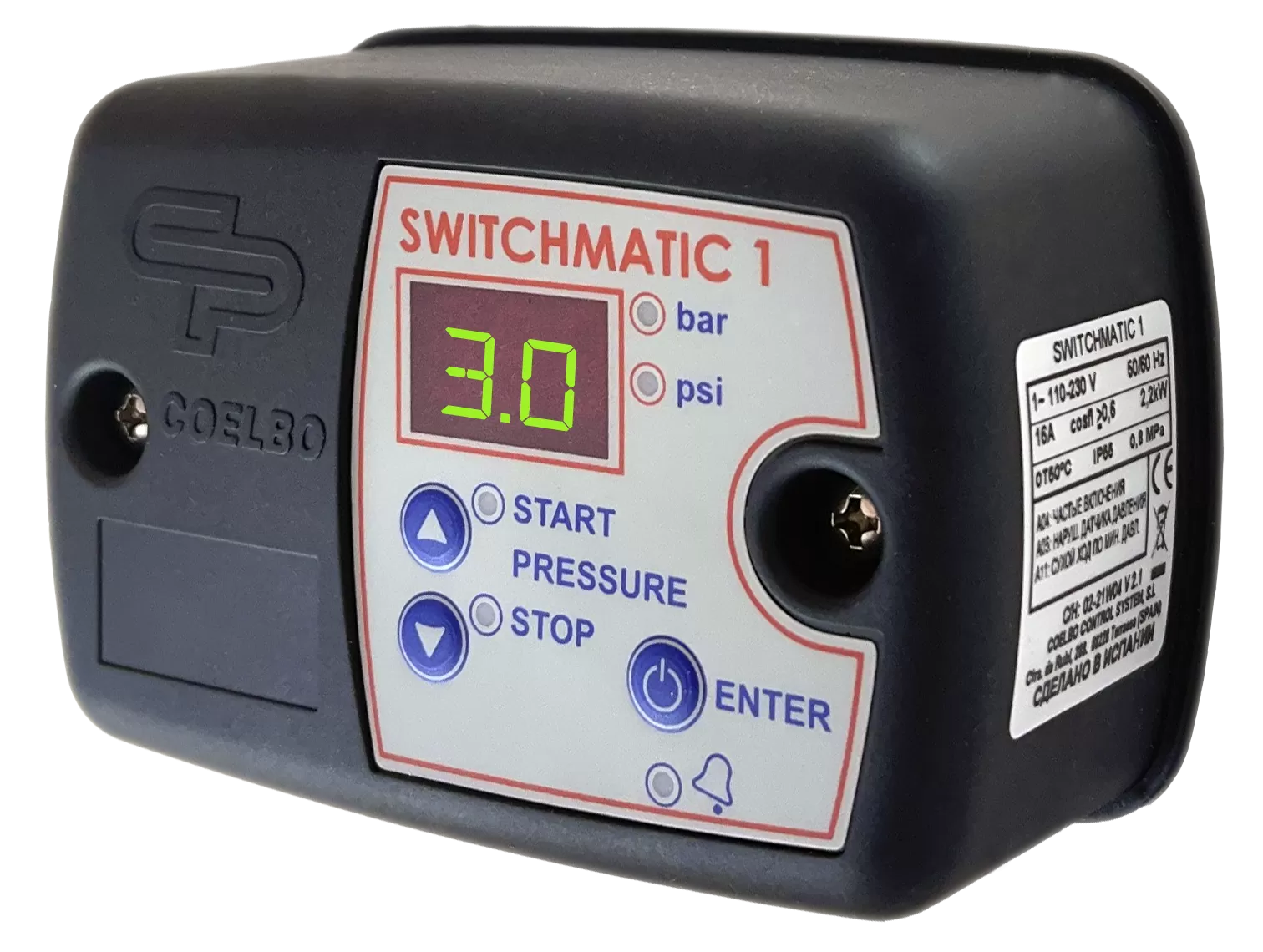 SWITCHMATIC 1/2/3 (T-KIT SWITCHMATIC 1 /2) микропроцессорные блоки управления (далее контроллер) для управления и защиты однофазных насосов до 16А. Позволяет устанавливать давление включения и выключения насоса. Электрическое подключение аналогично электромеханическому репе.