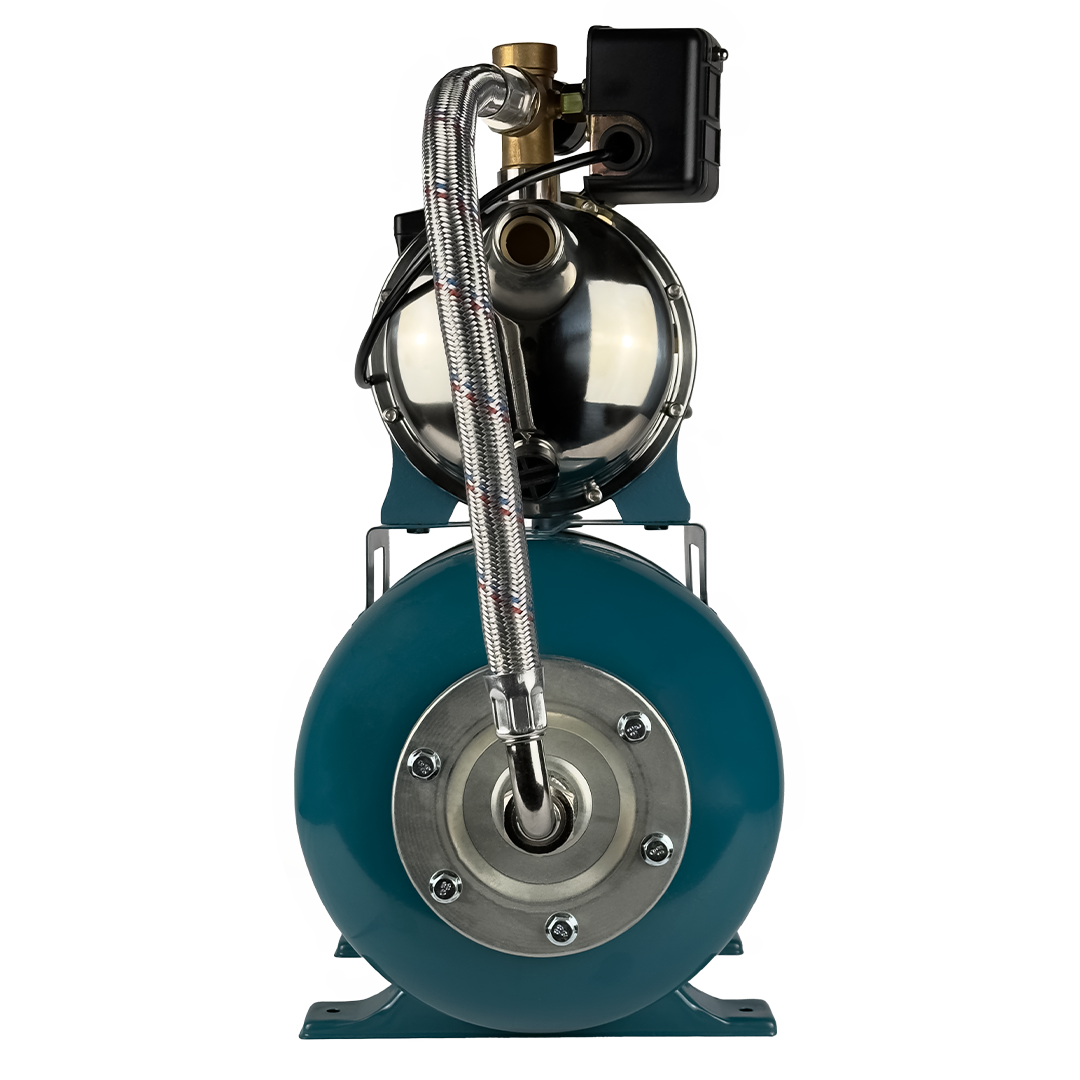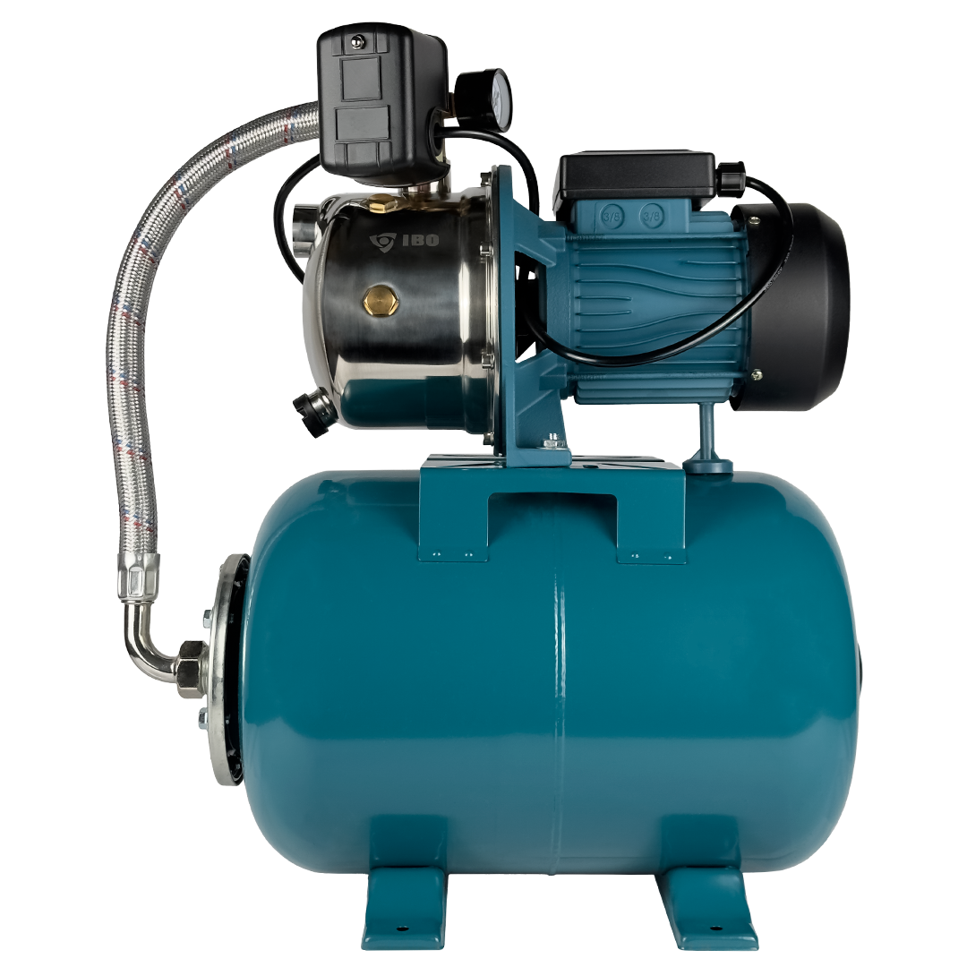 Насосная станция IBO AJ 50/60 24л+защита по сух,ходу оснащена системой увеличивающей мощность всасывания благодаря использованию трубки Вентури, благодаря данной системе насос способен поднять воду с глубины до 8 метров. Корпус насоса и вал в части, контактирующей с водой, выполнены из нержавеющей стали (версия INOX). Насосная станция имеет производительность в 3.6 м³/час, данной производительности будет достаточно чтобы организовать односемейного дома. За давление воды из крана отвечает напорная характеристика, максимальный напор в насосной станции IBO AJ 50/60 24л+защита по сух,ходу достигает 50 м. Насосная станция состоит из поверхностного самовсасывающего насос, системы автоматики на базе реле давления и манометра, гидроаккумулятора объемом 24 л. Насос имеет шнур питания с вилкой 0.5 м. Двигатель насоса оснащен тепловой защитой и имеет мощность в 1100 Вт.