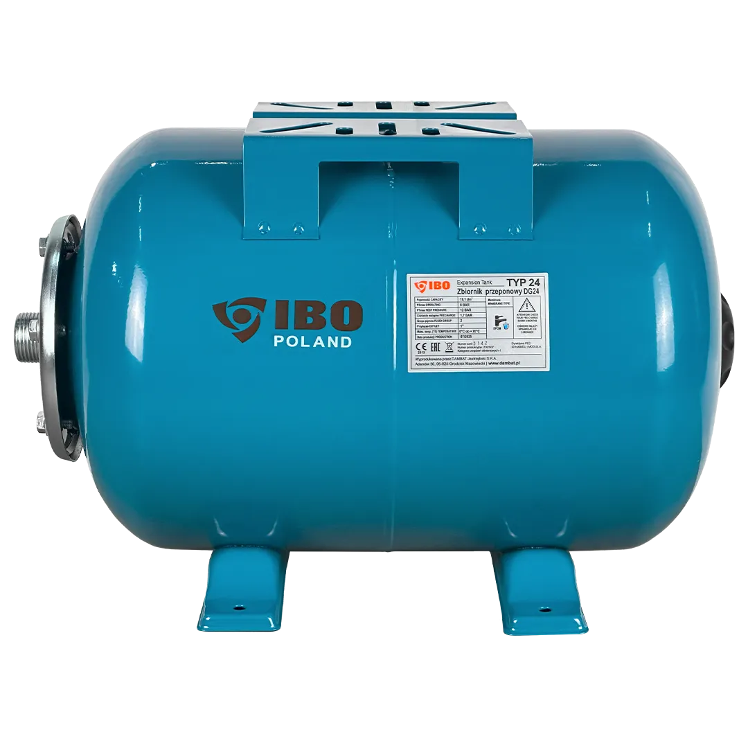 Горизонтальный мембранный бак для воды IBO объемом 24 литра. Бак выполнен из стали и покрыт специальным антикоррозионным составом. Мембрана бака выполнена из пищевой резины на основе бутилкаучука. Бак снабжен приварной площадкой для установки поверхностного насоса. В нижней части бака установлены металлические кронштейны с целью крепления бака к поверхности.
