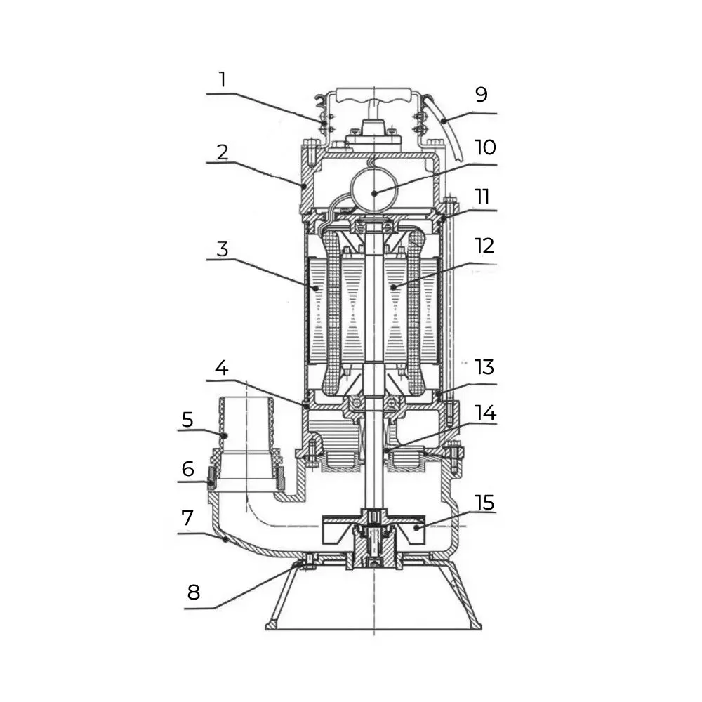 Защита от попадания жидкости: Электродвигатель размещен в закрытом от попадания жидкости кожухе, что обеспечивает безопасность и защиту от коррозии. Это позволяет использовать насос в различных условиях и с разными видами жидкостей. Рабочее колесо и измельчитель: Насос оснащен рабочим колесом, которое создает поток жидкости, и вращающимся ножом для измельчения волокнистых включений. Это помогает предотвратить блокировку насоса и обеспечивает более эффективную работу при наличии волокнистых частиц в жидкости. работу.