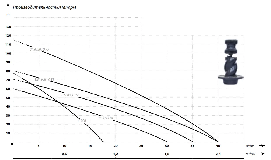 Насос для скважины IBO SQIBO 0,37 диаметром 75 мм. Насос в основном выполнен из нержавеющей стали, например, корпус, винты, патрубки и ротор. Насос оснащен электрическим кабелем 15 м. Максимальные характеристики скважинного насоса составляют в напоре 65 м, в производительности максимальное значение доходит до 1.8 м³/час. Насос обладает мощностью 370 Вт. Благодаря встроенному в двигатель конденсатору насос готов к установке сразу после распаковки. Насос оснащен тепловой защитой, установленной в обмотке двигателя. Насосы ИБО серии SQIBO являются одними из самых популярных винтовых насосов на Польском и Белоруском рынке. Признание клиентов они приобрели благодаря прочной конструкции и привлекательной цене.