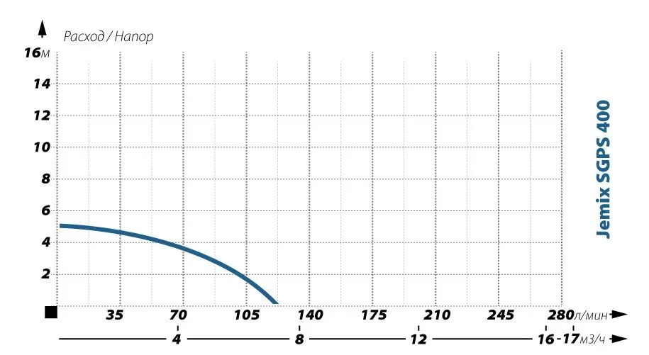 Фекальный насос Jemix SGPS 400 предназначен для откачивания канализационных, дренажных, дождевых и грунтовых вод в том числе включающие мягкие не абразивные фракции до 35 мм. Фекальный насос Jemix SGPS 400 имеет поплавковый выключатель который включает и отключает насос по уровню воды в автоматическом режиме, что предотвращает работу насоса без воды и повышает удобство использования. У насоса отличные напорно-расходные характеристики исходя из его мощности в 400 Вт. Максимальный напор насоса составляет 5м, а максимальная производительность в пике достигает 7.5 м³/час. Фекальный насос Jemix SGPS 400 состоит из корпуса, ручки для переноски, поплавкового выключателя, крыльчатки и электрического кабеля. В верхней части корпуса находятся: асинхронный, однофазный электродвигатель, пусковой конденсатор, тепловое реле. Пусковой конденсатор, необходим для начала вращения ротора электродвигателя. Тепловое реле в случае перегрева отключает электродвигатель и после охлаждения, включает в автоматическом режиме. После включения насоса, за счет движения крыльчатки, вода и примеси поступают в нижнюю часть насоса. Вода проходит сквозь отверстия в крышке и поступает в выходной патрубок. Поплавковый выключатель включает и отключает насос в автоматическом режиме при изменении уровня воды.