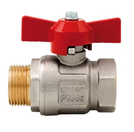 Тип — кран шаровой бабочка, Материал корпуса — латунь, Присоединительный размер — ½" внутренняя резьба x ½" наружная резьба.