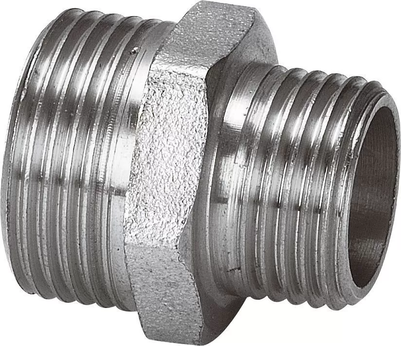 Ниппель переходной AQUALINK 1"М х 2"М – специальный соединительный элемент, цилиндр, на два конца которого снаружи нанесена резьба, что предусматривает монтирование системы путем вкручивания, используются для создания разъемных резьбовых соединений на трубопроводах холодного питьевого, хозяйственного и горячего водоснабжения, отопления, сжатого воздуха и на технологических трубопроводах, транспортирующих газы и жидкости, неагрессивные к материалу соединителей. Посередине данной конструкции для удобства присоединения предусмотрена шестигранная гайка, поэтому монтаж легко можно осуществить с помощью обычного гаечного ключа. Резьбовое присоединение ниппелей характерно для соединения в тех местах, где предусмотрена неоднократная разборка конструкции или же исключена работа с открытым пламенем. Применяется для соединения деталей трубопроводов с разной резьбой или для перехода с большей резьбы на меньшую.