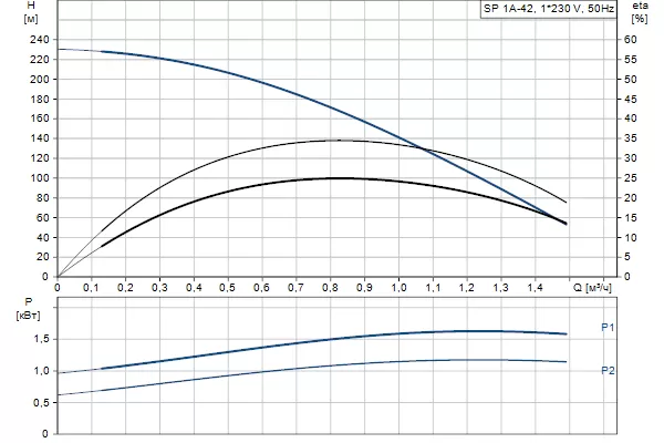 Насос Grundfos SP 1A-42 создан с применением новейших гидравлических технологий. Grundfos SP 1A-42 созданные специально для того, чтобы обеспечивать максимальную эффективность в периоды высокой нагрузки, насос имеет низкую стоимость и высокую надёжность эксплуатации вне зависимости от вида назначения. Grundfos SP 1A-42 обеспечивает высокую эффективность, высокое сопротивление абразивному износу (песку и иным абразивам), защиту от перегрева двигателя и простоту технического обслуживания. Также доступна готовая к применению система контроля и управления, предназначенная для постоянной оптимизации работы насосной системы. Максимальная производительность насоса 1.4 м3/час, максимальный напор 230 м при мощности электродвигателя 1100 Вт. Насос работает от сети 220 в. Гарантийный срок на насос Grundfos SP 1A-42 составляет 2 года.