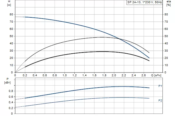 Насос Grundfos SP 2A-13 создан с применением новейших гидравлических технологий. Grundfos SP 2A-13 созданные специально для того, чтобы обеспечивать максимальную эффективность в периоды высокой нагрузки, насос имеет низкую стоимость и высокую надёжность эксплуатации вне зависимости от вида назначения. Grundfos SP 2A-13 обеспечивает высокую эффективность, высокое сопротивление абразивному износу (песку и иным абразивам), защиту от перегрева двигателя и простоту технического обслуживания. Также доступна готовая к применению система контроля и управления, предназначенная для постоянной оптимизации работы насосной системы. Максимальная производительность насоса 2.6 м3/час, максимальный напор 78 м при мощности электродвигателя 550 Вт. Насос работает от сети 220 в. Гарантийный срок на насос Grundfos SP 2A-13 составляет 2 года.