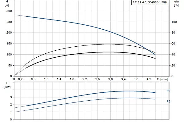 Насос Grundfos SP 3A-45 создан с применением новейших гидравлических технологий. Grundfos SP 3A-45 созданные специально для того, чтобы обеспечивать максимальную эффективность в периоды высокой нагрузки, насос имеет низкую стоимость и высокую надёжность эксплуатации вне зависимости от вида назначения. Grundfos SP 3A-45 обеспечивает высокую эффективность, высокое сопротивление абразивному износу (песку и иным абразивам), защиту от перегрева двигателя и простоту технического обслуживания. Также доступна готовая к применению система контроля и управления, предназначенная для постоянной оптимизации работы насосной системы. Максимальная производительность насоса 4.3 м3/час, максимальный напор 280 м при мощности электродвигателя 3000 Вт. Насос работает от сети 380 в. Гарантийный срок на насос Grundfos SP 3A-45 составляет 2 года.