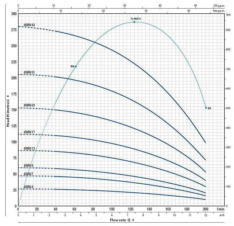 Глубинный насос Pedrollo 4SR8/42-P, отличается объективной ценой и надежной работой всех исполнительных механизмов. Насос Pedrollo 4SR8/42-P достаточно простой в эксплуатации и обслуживании, поэтому отлично подходит как для домашнего, так и промышленного применения.В основе работы Pedrollo 4SR8/42-P лежит конструктивно простой, но функционально успешный многоступенчатый центробежный принцип. Электрический двигатель подключается к агрегату через суппорт, в соответствии с нормативами международного стандарта NEMA. Мощность электродвигателя насоса составляет 7500 Вт . И при таких показателях мощности насос обладает максимальным напором в 280 метров и максимальной производительностью 12 м3/час. Функционирование Pedrollo 4SR8/42-P идентично большинству устройств, основанных на центробежных механизмах подачи воды. Жидкость втягивается в корпус устройства благодаря центробежной силе, создаваемой рабочими колесами, которые также проталкивают воду через все тело насоса "диаметр насоса 4"", а затем в нагнетающий патрубок "диаметр патрубка 2"", через который вода и попадает к конечному потребителю. Главной особенностью насоса Pedrollo 4SR8/42-P является малый диаметр корпуса агрегата, а также то, что перекачиваемая вода не касается стенок двигателя. Между жидкостью и корпусом движущей установки располагается прослойка из технологического масла, которая и предотвращает попадание мелких частиц непосредственно в исполнительный механизм. В то время как охлаждение электропривода происходит за счет верхнего способа забора воды, т.е. перекачиваемая жидкость находится всегда выше уровня расположения двигателя. Насос питается от сети в 380 в и комплектуется кабелем 4 метров.
